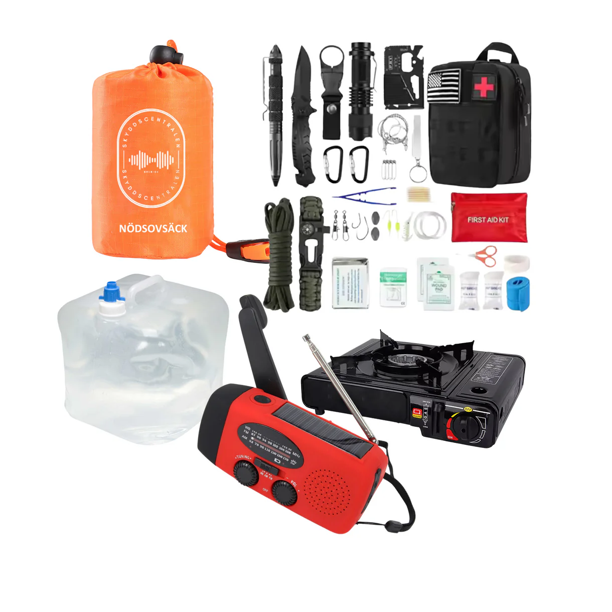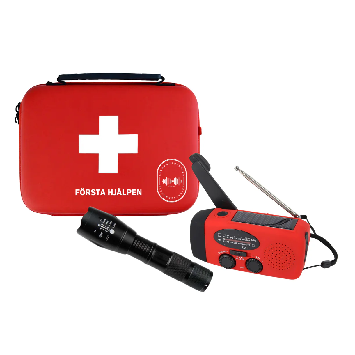 Akutpaketet innehåller vår välfyllda Första Hjälpen-väska, en mångsidig nödradio med vev, solceller samt powerbank och en extremt kraftfull ficklampa.